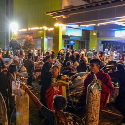 Pasien RSUD Kabupaten Sumedang dipindahkan ke Jalan Raya usai gempa bumi dengan magnitudo 4,8 di Kabupaten Sumedang, Jawa Barat, Minggu (31/12/2023). Pihak RSUD Kabupaten Sumedang memindahkan pasien keluar ruangan guna mengantisipasi runtuhnya bangun