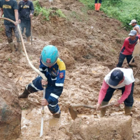 Petugas Tagana membersihkan material longsor yang menutup jalan di Kabupaten Tasikmalaya, Jawa Barat. (ANTARA/HO-Tagana Tasikmalaya)