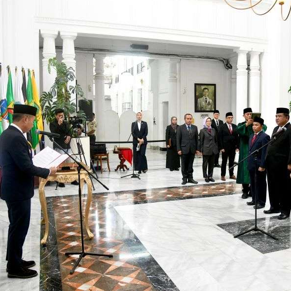Penjabat Gubernur Jawa Barat Bey Machmudin melantik anggota Komisi Informasi Jawa Barat masa jabatan 2024 - 2028 di Gedung Sate Kota Bandung, Senin (23/12/2024).