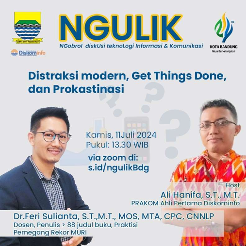 Diskominfo Kota Bandung kembali menggelar diskusi publik Ngulik (Ngobrol Diskusi Teknologi Informasi dan Komunikasi). Pada edisi kali ini, mengundang Feri Sulianta seorang akademisi dan praktisi komunikasi, Kamis (11/7/2024). Bertajuk “Distraksi Modern, Get Things Done and Prokastinasi”, pada edisi ini, peserta mendapatkan materi tentang dampak penggunaan media sosial terhadap aspek kehidupan.